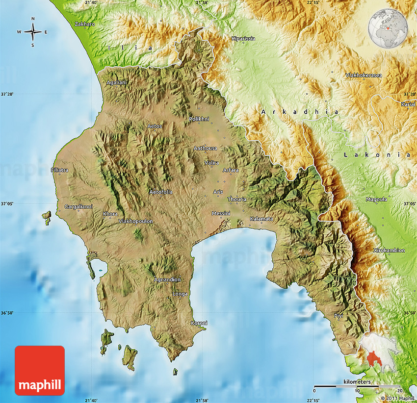 Physical map illustrates the mountains, lowlands, oceans, lakes and rivers and other physical landscape features of Messinia. Differences in land elevations relative to the sea level are represented by color.