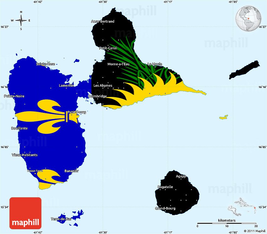Flag map shows the flag of Guadeloupe clipped inside the country's borders. Flag image is resized to match the width and height of the country's outline. Maphill flag maps are more precise than often used flag clip art illustrations.