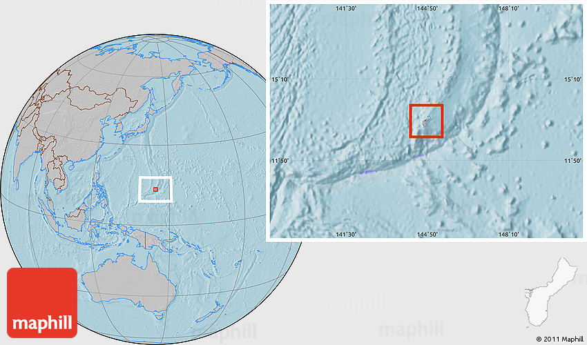 Maphill is a collection of map images. This image combines a shaded relief map with the globe centered on Guam. Use the buttons under the image to switch to different map types.