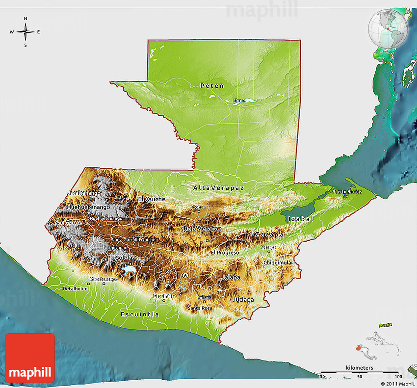 Physical map illustrates the mountains, lowlands, oceans, lakes and rivers and other physical landscape features of Guatemala. Differences in land elevations relative to the sea level are represented by color.