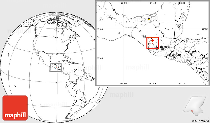 The location map of S.Gaspar Ixchil combines two projections: the orthographic azimuthal projection for the globe and the simple geographic projection for the rectangular part of the map. Geographic projection has straight meridians and parallels, each degree of latitude and longitude is the same size over the entire world map.