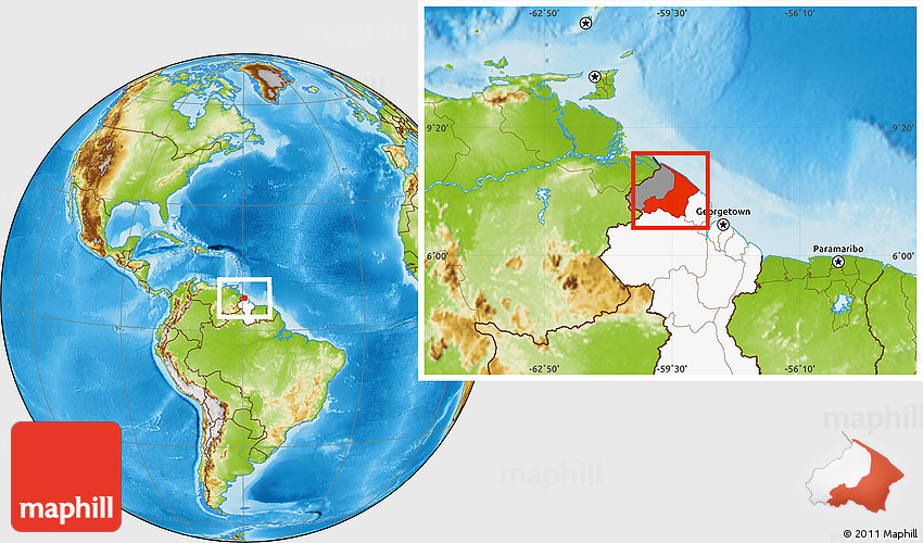 Maphill is a collection of map images. This image combines a physical map with the globe centered on I-2 Waini. Use the buttons under the image to switch to different map types.