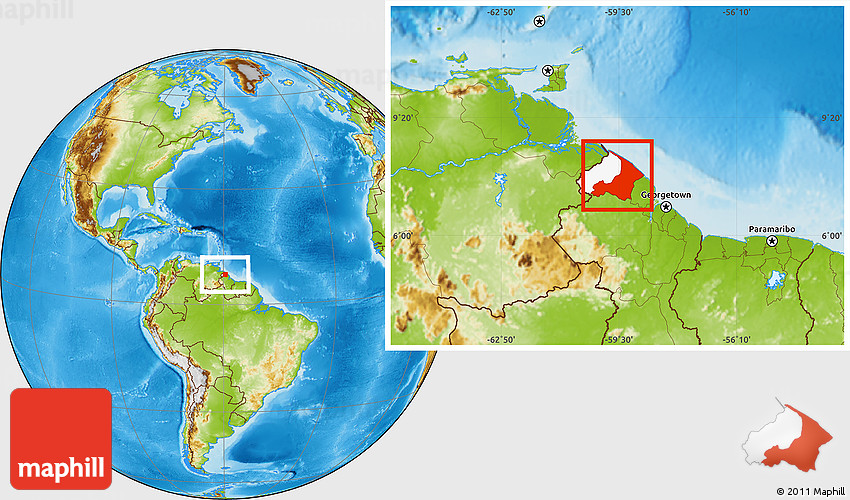 Maphill is a collection of map images. This image combines a physical map with the globe centered on I-2 Waini. Use the buttons under the image to switch to different map types.