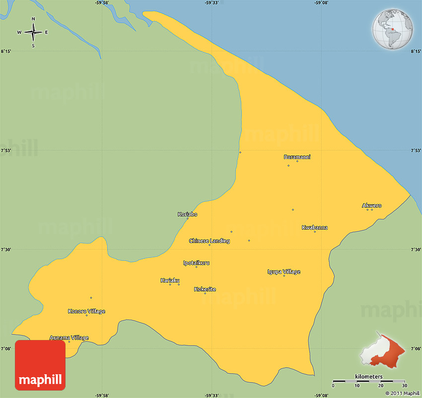 The simple savanna style outline map represents one of several map types and styles available. Look at I-2 Waini, Barima/waini, Guyana from different perspectives.