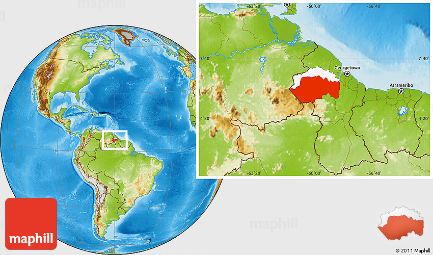 Maphill is a collection of map images. This image combines a physical map with the globe centered on VII-2 Mazaruni/L.B.E.Rive. Use the buttons under the image to switch to different map types.