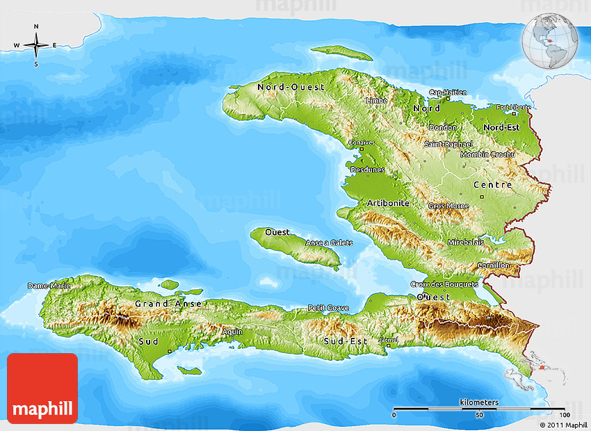 Physical map illustrates the mountains, lowlands, oceans, lakes and rivers and other physical landscape features of Haiti. Differences in land elevations relative to the sea level are represented by color.