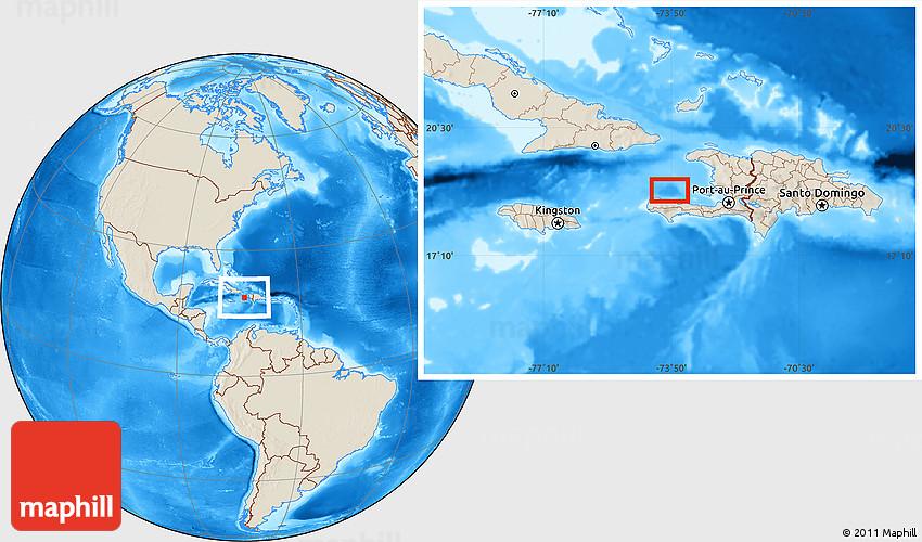Maphill is a collection of map images. This image combines a shaded relief map with the globe centered on Trou Bonbon. Use the buttons under the image to switch to different map types.