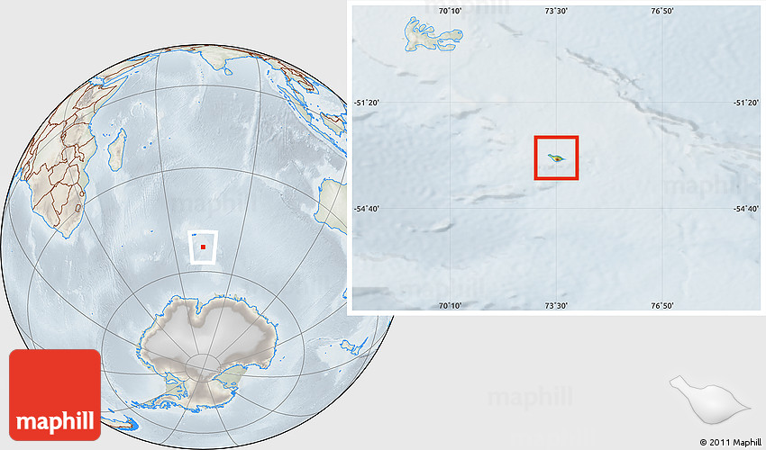 Maphill is a collection of map images. This image combines a physical map with the globe centered on Heard Island and McDonald Islands. Use the buttons under the image to switch to different map types.
