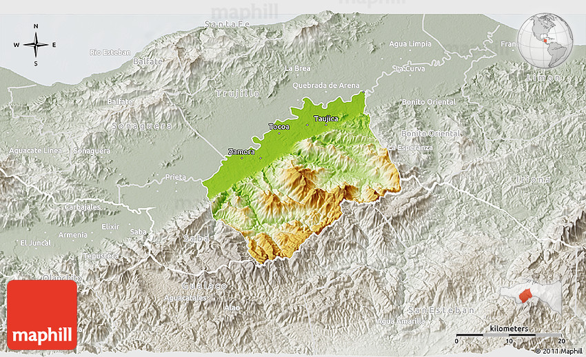 Physical map illustrates the mountains, lowlands, oceans, lakes and rivers and other physical landscape features of Tocoa. Differences in land elevations relative to the sea level are represented by color.