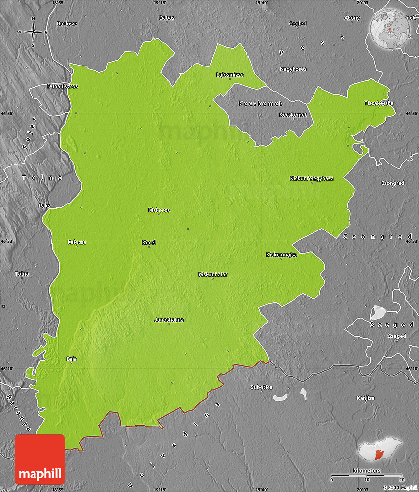 Physical map illustrates the mountains, lowlands, oceans, lakes and rivers and other physical landscape features of Bács-Kiskun. Differences in land elevations relative to the sea level are represented by color.