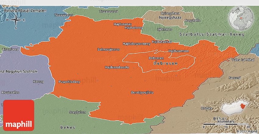 The panoramic political map represents one of many map types and styles available. Look at Hajdú-Bihar from different perspectives.
