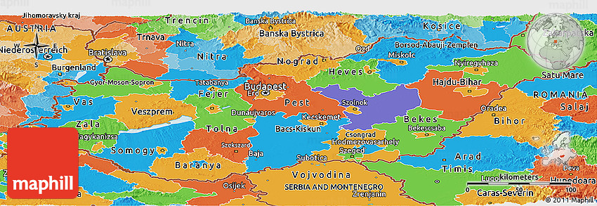 The panoramic political map represents one of many map types and styles available. Look at Hungary from different perspectives.