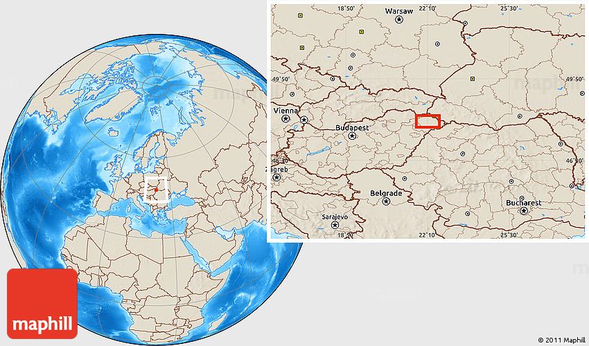 Maphill is a collection of map images. This image combines a shaded relief map with the globe centered on Kisvárda. Use the buttons under the image to switch to different map types.