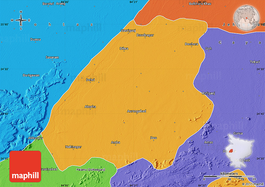 The flat political map represents one of several map types and styles available. Look at Aurangabad, Bihar, India from different perspectives.