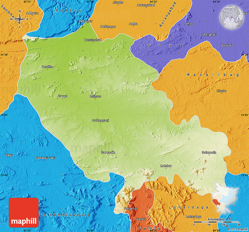 Each map type offers different information and each map style is designed for a different purpose. Read about the styles and map projection used in the above map (Physical Map of Palamu (Daltenganj), political outside).