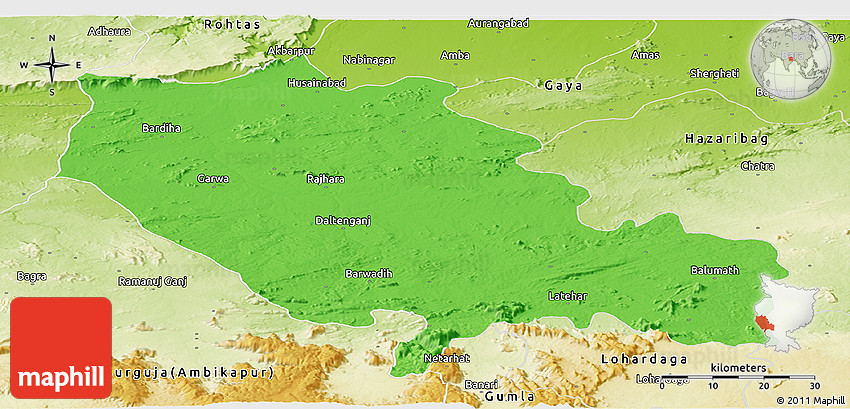 Physical map illustrates the mountains, lowlands, oceans, lakes and rivers and other physical landscape features of Palamu (Daltenganj). Differences in land elevations relative to the sea level are represented by color.