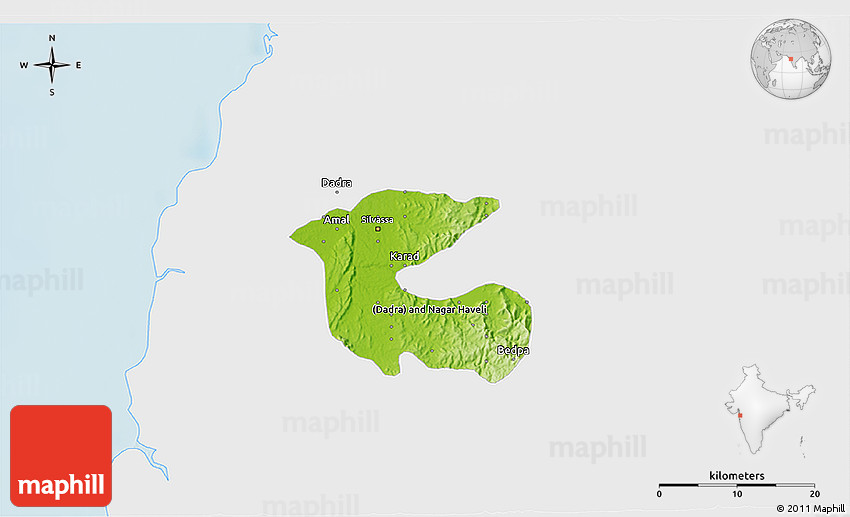 Physical map illustrates the mountains, lowlands, oceans, lakes and rivers and other physical landscape features of Dadra and Nagar Haveli. Differences in land elevations relative to the sea level are represented by color.