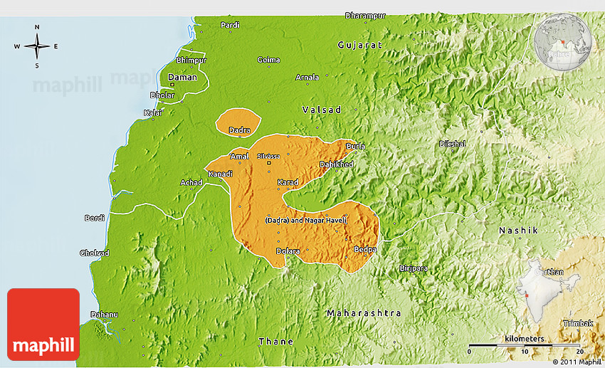 Physical map illustrates the mountains, lowlands, oceans, lakes and rivers and other physical landscape features of Dadra and Nagar Haveli. Differences in land elevations relative to the sea level are represented by color.