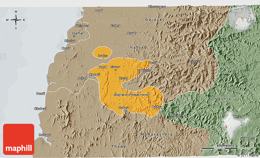 The 3D political map represents one of many map types and styles available. Look at Dadra and Nagar Haveli from different perspectives.