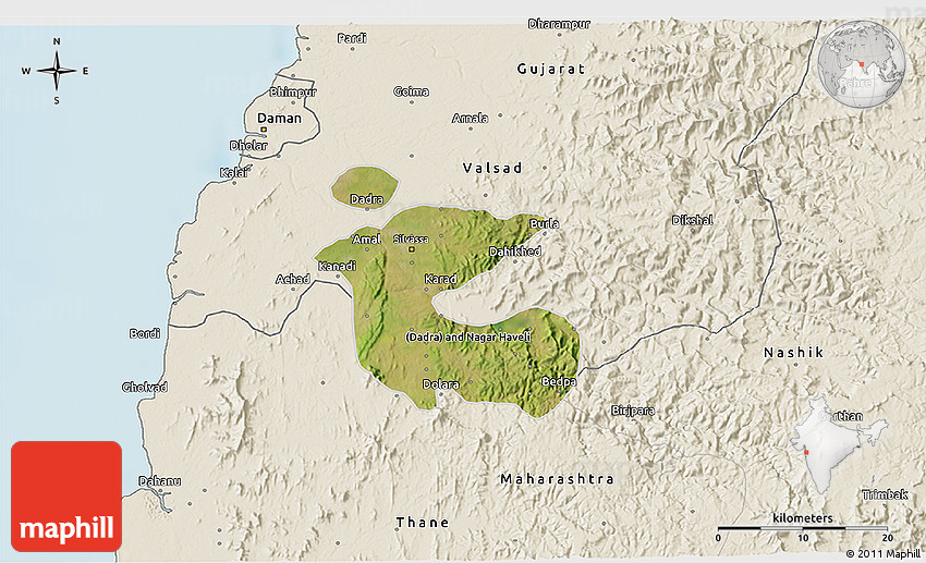 Shaded relief map shows landscape features, such as mountains, valleys and plateaus. Flat areas are smooth on the map, areas with steep slopes and mountains appear more rough. The above map of Dadra and Nagar Haveli was created using a digital elevation model.