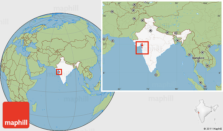 The location map of Dadra and Nagar Haveli combines two projections: the orthographic azimuthal projection for the globe and the simple geographic projection for the rectangular part of the map. Geographic projection has straight meridians and parallels, each degree of latitude and longitude is the same size over the entire world map.