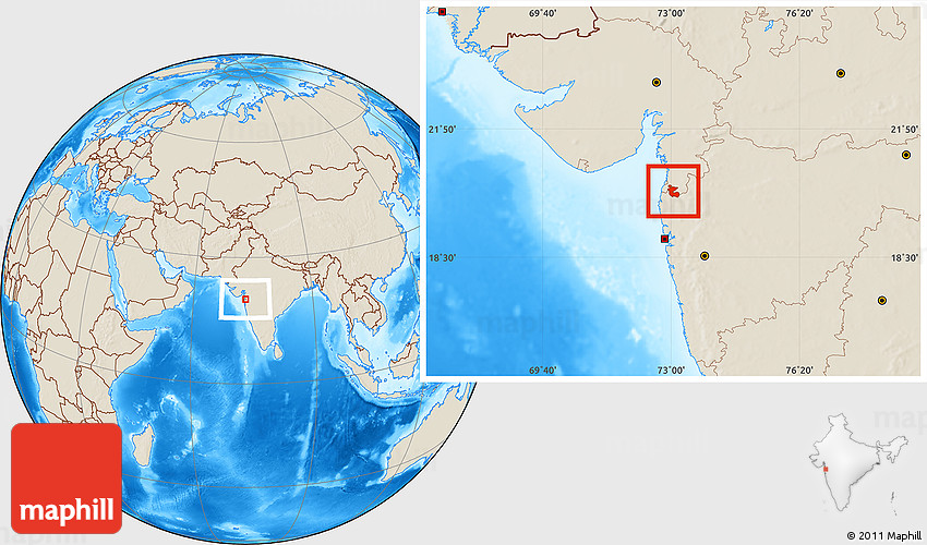 Maphill is a collection of map images. This image combines a shaded relief map with the globe centered on Dadra and Nagar Haveli. Use the buttons under the image to switch to different map types.