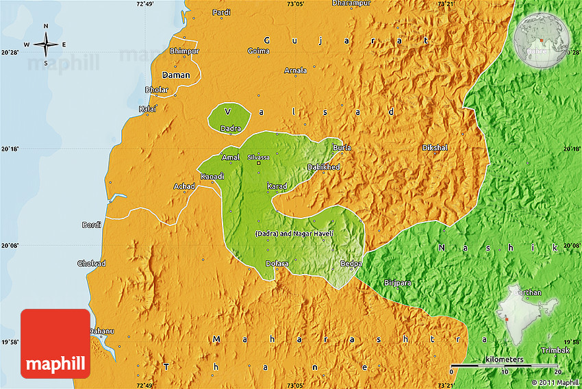 Maphill is a collection of map images. This physical map of Dadra and Nagar Haveli is one of them. Click on the Detailed button under the image to switch to a more detailed map.