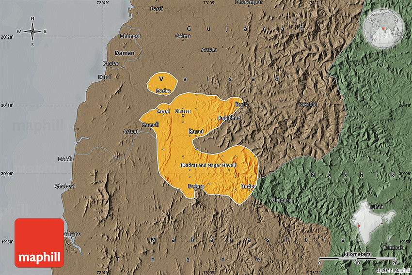Maphill is a collection of map images. This political map of Dadra and Nagar Haveli is one of them. Click on the Detailed button under the image to switch to a more detailed map.