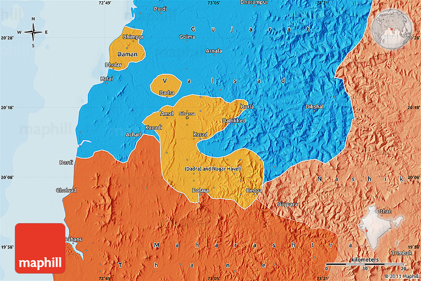 Maphill is a collection of map images. This political map of Dadra and Nagar Haveli is one of them. Click on the Detailed button under the image to switch to a more detailed map.