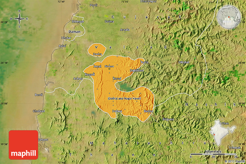 Satellite map shows the Earth's surface as it really looks like. The above map is based on satellite images taken on July 2004. This satellite map of Dadra and Nagar Haveli is meant for illustration purposes only. For more detailed maps based on newer satellite and aerial images switch to a detailed map view.