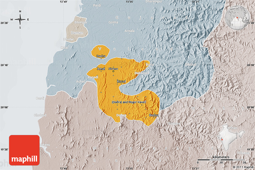 Maphill is a collection of map images. This political shades map of Dadra and Nagar Haveli is one of them. Click on the Detailed button under the image to switch to a more detailed map.
