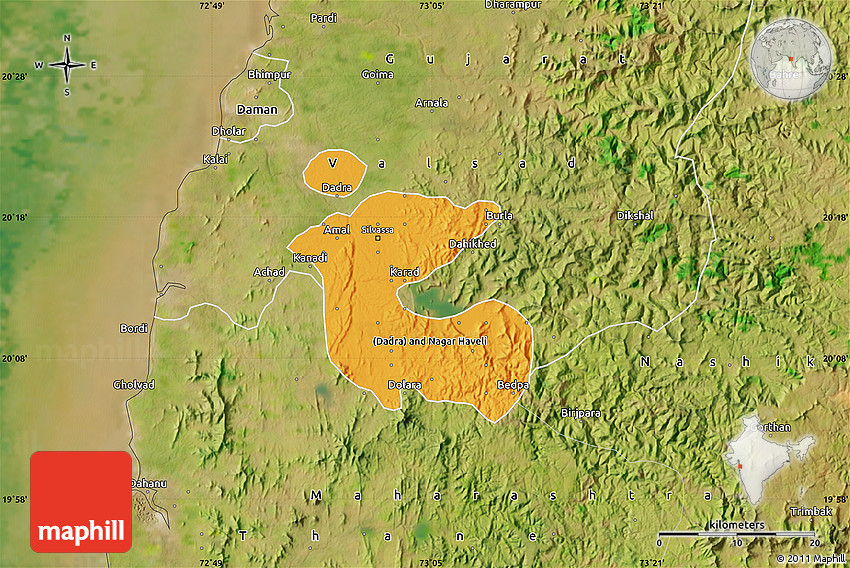 Satellite map shows the Earth's surface as it really looks like. The above map is based on satellite images taken on July 2004. This satellite map of Dadra and Nagar Haveli is meant for illustration purposes only. For more detailed maps based on newer satellite and aerial images switch to a detailed map view.