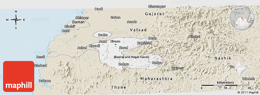 This map uses colors of vintage antique maps. Dadra and Nagar Haveli is highlighted with white. The rest of the map is beige colored shaded relief map.