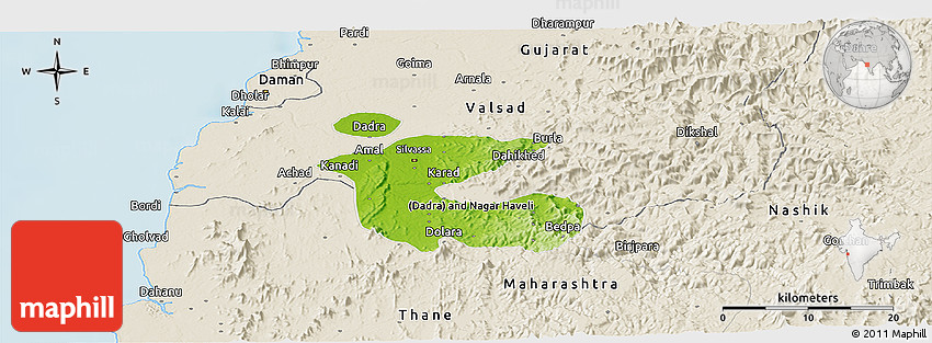 Shaded relief map shows landscape features, such as mountains, valleys and plateaus. Flat areas are smooth on the map, areas with steep slopes and mountains appear more rough. The above map of Dadra and Nagar Haveli was created using a digital elevation model.
