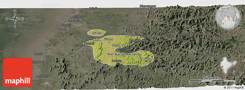 Embed the above satellite panoramic map of Dadra and Nagar Haveli into your website. Enrich your blog with quality map graphics. Make the web a more beautiful place.