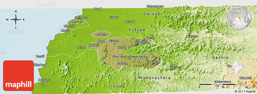 Physical map illustrates the mountains, lowlands, oceans, lakes and rivers and other physical landscape features of Dadra and Nagar Haveli. Differences in land elevations relative to the sea level are represented by color.