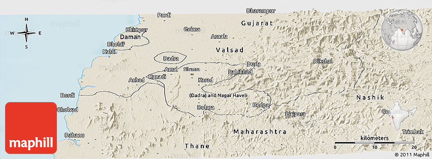 Shaded relief map shows landscape features, such as mountains, valleys and plateaus. Flat areas are smooth on the map, areas with steep slopes and mountains appear more rough. The above map of Dadra and Nagar Haveli was created using a digital elevation model.