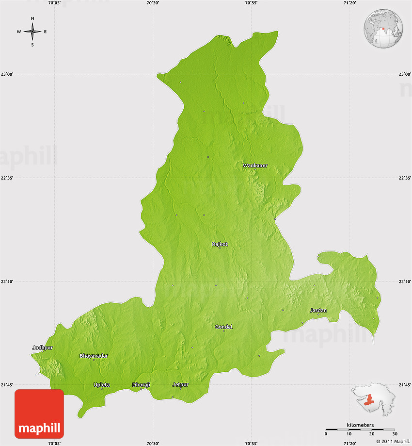 Each map type offers different information and each map style is designed for a different purpose. Read about the styles and map projection used in the above map (Physical Map of Rajkot, cropped outside).