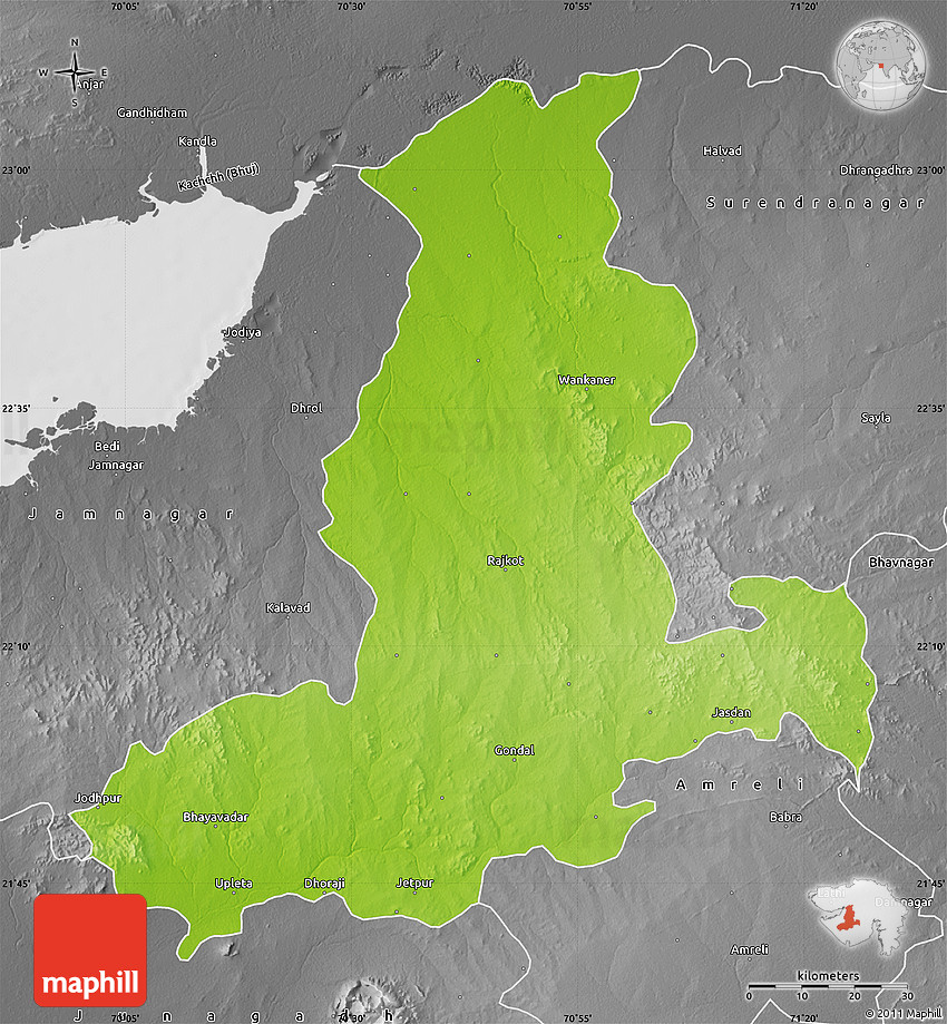 Physical map illustrates the mountains, lowlands, oceans, lakes and rivers and other physical landscape features of Rajkot. Differences in land elevations relative to the sea level are represented by color.