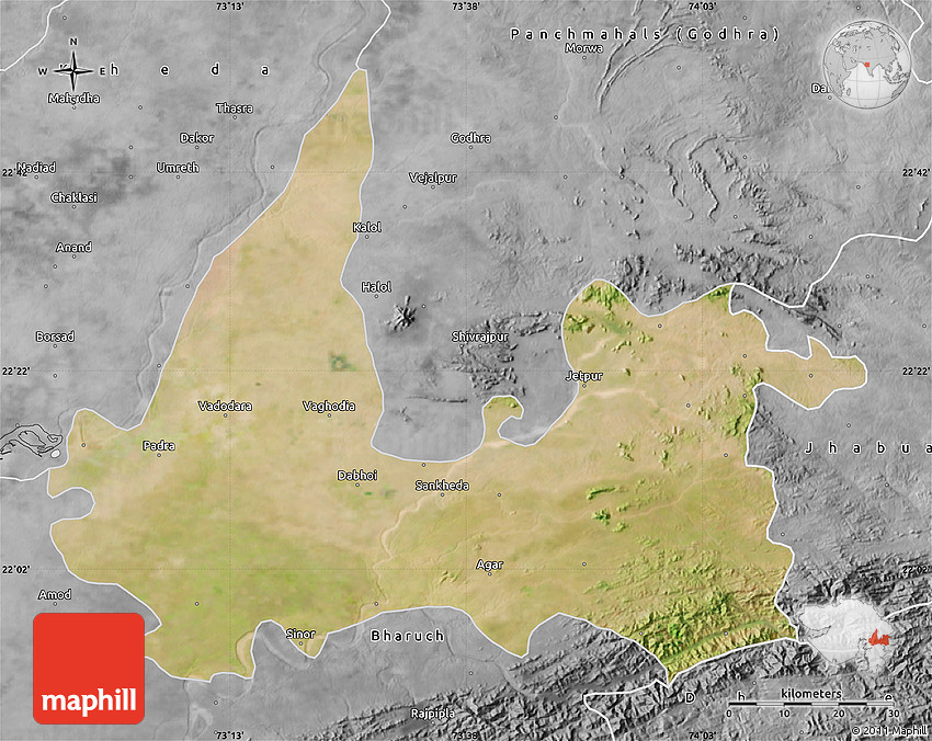 Each map type offers different information and each map style is designed for a different purpose. Read about the styles and map projection used in the above map (Satellite Map of Vadodara, desaturated).