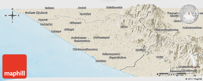 Shaded relief map shows landscape features, such as mountains, valleys and plateaus. Flat areas are smooth on the map, areas with steep slopes and mountains appear more rough. The above map of Thiruvananthapuram (Triv) was created using a digital elevation model.