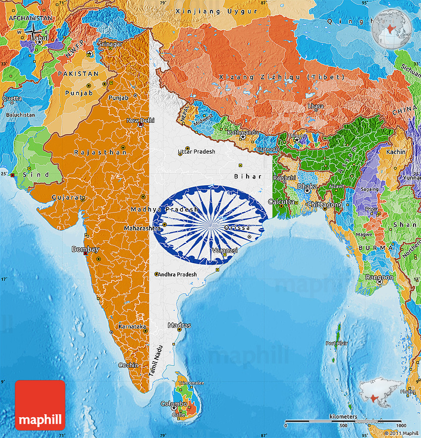 Maphill is a collection of map images. This flag map of India is one of them. Click on the Detailed button under the image to switch to a more detailed map.