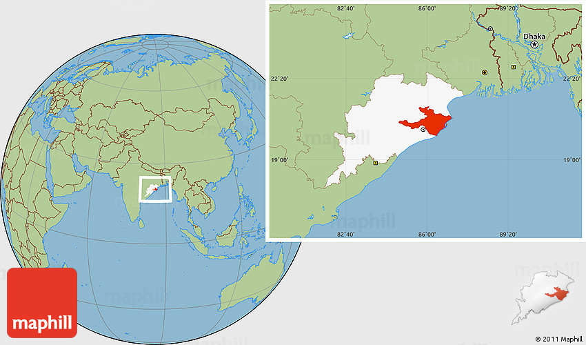 Maphill is a collection of map images. This image combines a savanna style map with the globe centered on Cuttack. Use the buttons under the image to switch to different map types.