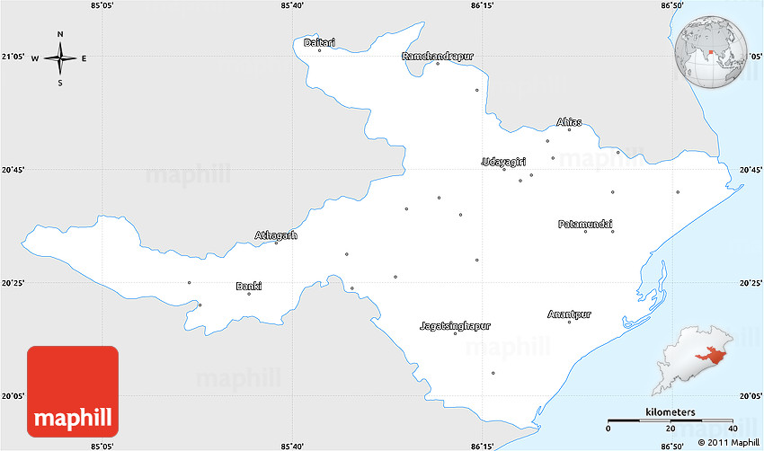 The simple silver style outline map represents one of several map types and styles available. Look at Cuttack, Orissa, India from different perspectives.