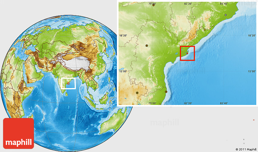 Maphill is a collection of map images. This image combines a physical map with the globe centered on Yanam. Use the buttons under the image to switch to different map types.