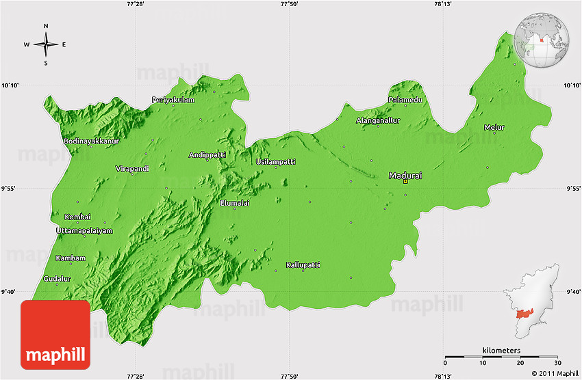 The flat political map represents one of several map types and styles available. Look at Madurai, Tamil Nadu, India from different perspectives.