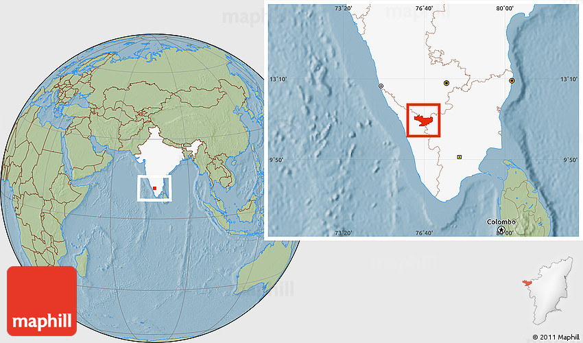 Maphill is a collection of map images. This image combines a savanna style map with the globe centered on Nilgiris. Use the buttons under the image to switch to different map types.