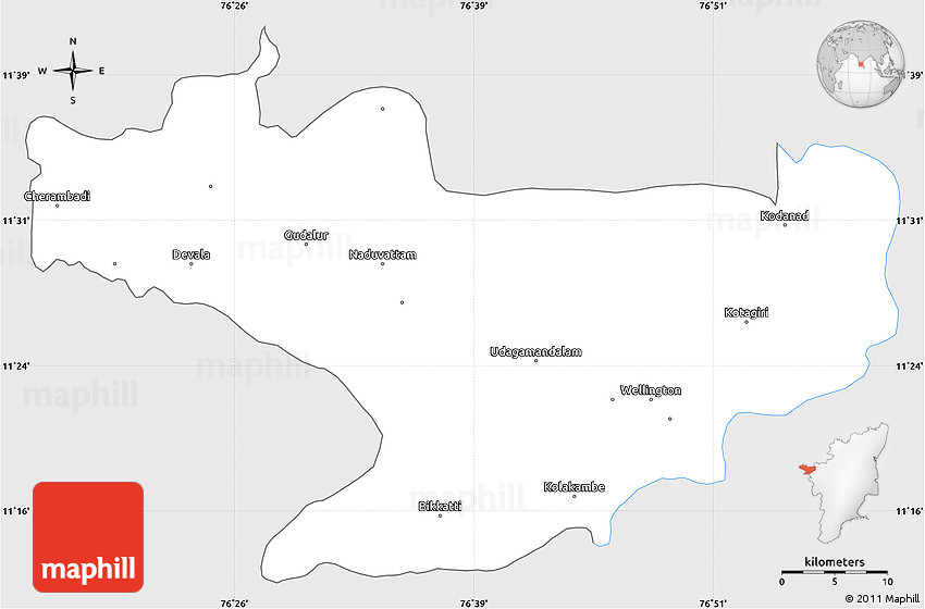 The simple silver style outline map represents one of several map types and styles available. Look at Nilgiris, Tamil Nadu, India from different perspectives.