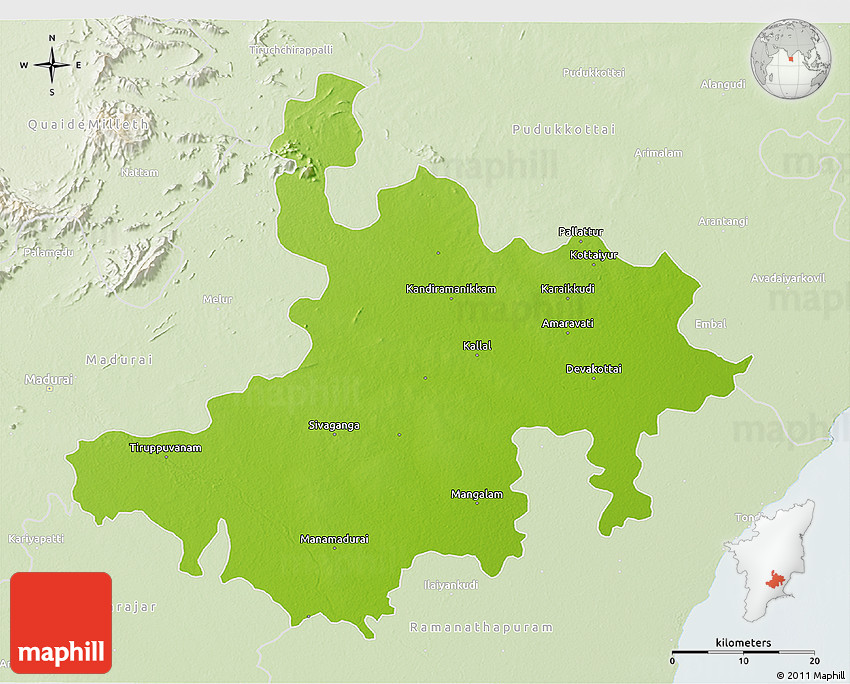 Physical map illustrates the mountains, lowlands, oceans, lakes and rivers and other physical landscape features of Pasumpon Muthuramalingam. Differences in land elevations relative to the sea level are represented by color.