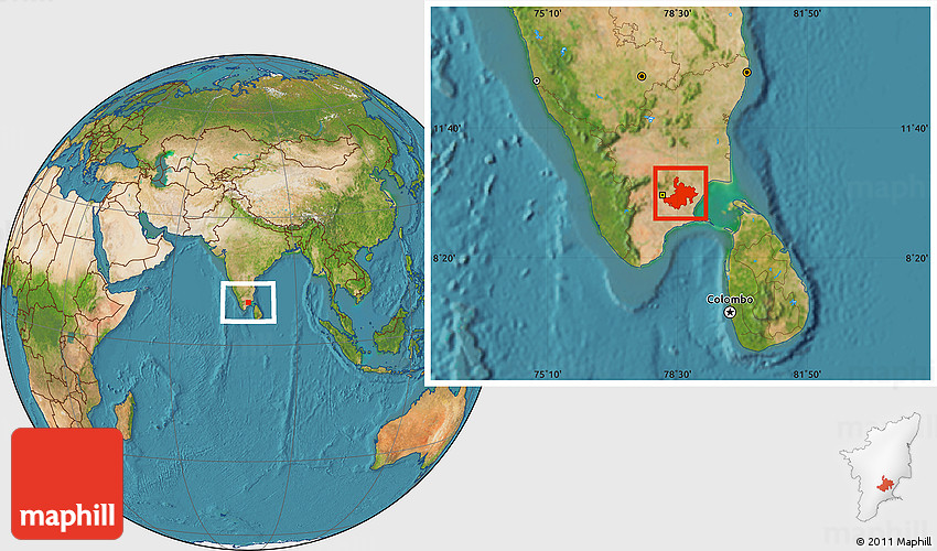 Maphill is a collection of map images. This image combines a satellite map with the globe centered on Pasumpon Muthuramalingam. Use the buttons under the image to switch to different map types.